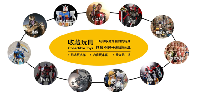 玩具泛指可用来玩的物品,凡是可以玩的、看的、听的和触摸的东西,都可以叫玩具。收藏是一个动词,是人类社会发展中,一直在持续的一种活动。收藏玩具是玩具与人类社会活动发展后衍生的商品分类,也是人类对精神追求的一种情感投射物。品类丰富,形式多样,受众群体更广泛。包括手办、GK、BJD、潮流玩具、积木、可动人偶、拼装模型、雕像等。