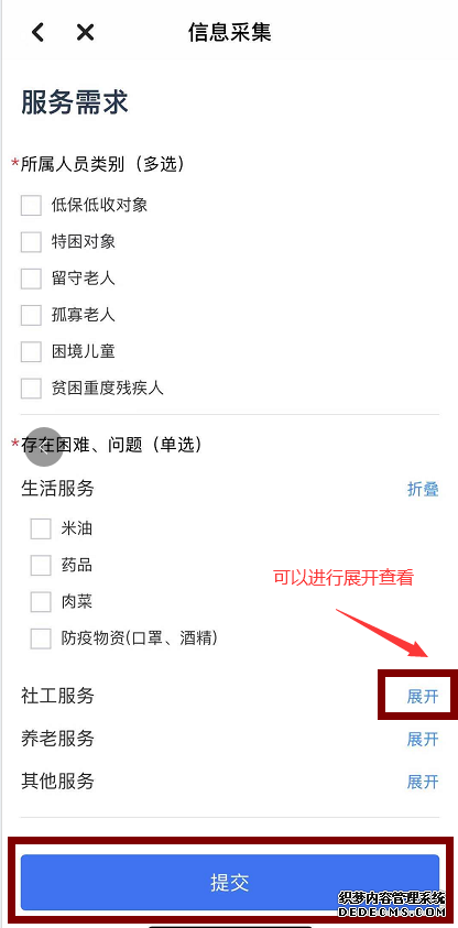 服务内容包括生活服务、社工服务、养老服务和其他服务。其中,生活服务涵盖米油、药品、肉菜、防疫物资(口罩、酒精),社工服务提供心理疏导、情绪支持、资源链接、政策咨询、危机干预等服务。
