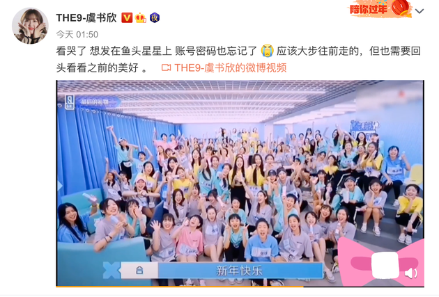新浪娱乐讯 21日凌晨,THE9成员虞书欣分享出《青春有你2》时期109位女孩在一起玩耍、吃饭的视频,表示“看哭了 想发在鱼头星星上 账号密码也忘记了 [泪] 应该大步往前走的,但也需要回头看看之前的美好”。