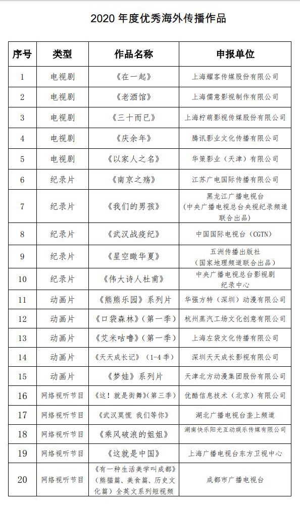 经专家评审,共有20部被评定为2020年度优秀海外传播作品,包括《在一起》《老酒馆》《三十而已》《庆余年》《以家人之名》《武汉战疫纪》《这!就是街舞》第三季、《乘风破浪的姐姐》等。