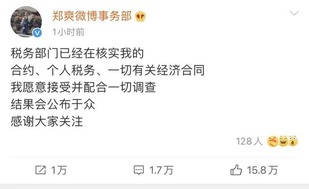 在被前男友张恒指控存在偷税漏税,并且晒出了众多聊天截图,引起轩然大波后,4月29日午间,郑爽在社交平台回应称:“税务部门已经在核实我的合约、个人税务、一切有关经济合同,我愿意接受并配合一切调查,结果会公布于众。”