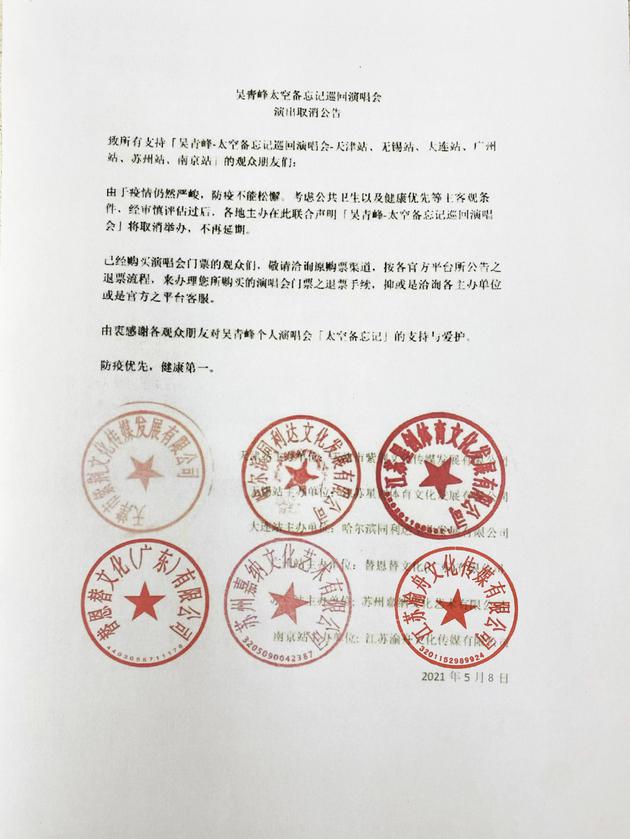 吴青峰太空备忘记巡回演唱会-天津站、无锡站、大连站、广州站、苏州站、南京站》取消公告,并对所有歌迷与观众朋友深表歉意。